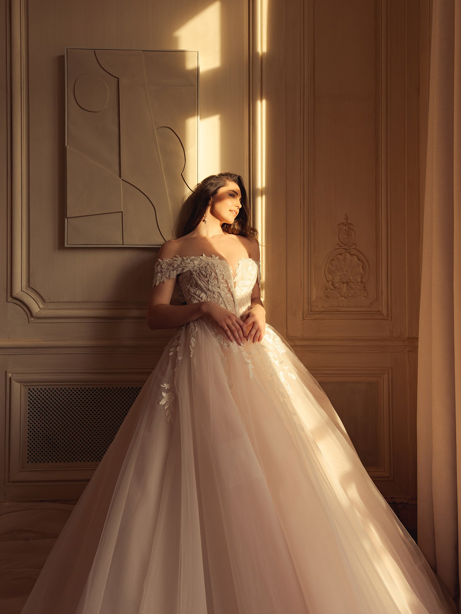 Bathed in golden natural light, the campaign unfolds within a timeless interior where sculpted moldings and tall windows echo the structure of the gowns. Each silhouette is approached as a living sculpture, balancing delicacy and strength, fluid tulle and structured corsetry, transparency and intricate lacework.